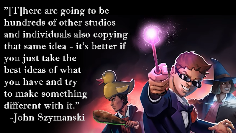 “看到某类游戏爆火,很容易就想跟风模仿蹭热度,”约翰·什曼斯基(John Szymanski)提醒道,“但现实是,成百上千的工作室和个人都在复制相同的创意。与其这样,不如提炼自己最出色的创意,尝试打造独一无二的作品。”