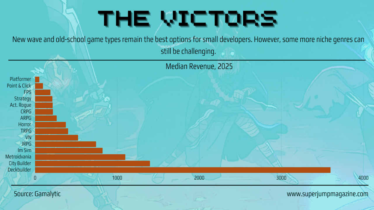行业基本法则始终未变:独立开发者的优势恰恰是行业巨头的薄弱领域。这些优势可分为两大截然不同的类别:其一是诞生于独立游戏圈的新潮游戏类型,包括开放世界生存类(open world survival)、卡牌构建类(deck builders)以及肉鸽游戏(rogue like subgenres);其二是被主流公司放弃的传统类型,包括城市建造类(city builders)和多角色扮演子题材(RPG subcategories)。对新兴开发者而言,以上类型无疑是比较安全的选择,因为它们不太会与行业巨头正面交锋。