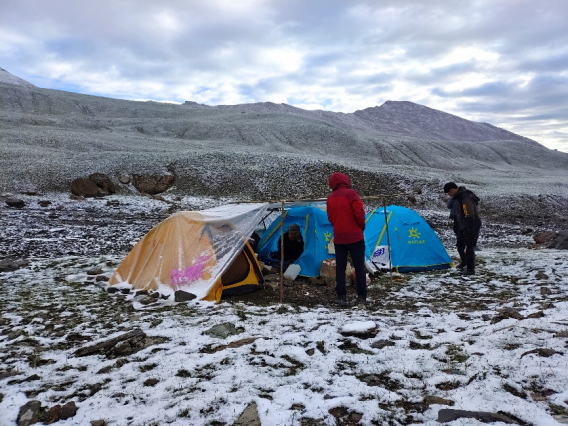 曹泊虽年轻,却常像长辈一样,走到哪儿讲到哪儿,把他当年爬冰川的故事娓娓道来。那时条件远不如现在,他们得在冰途中扎帐篷过夜,甚至有时还得借住牧民家中。读博时他作为师兄,考察冰川时都带队在冰川末端扎营,每天清早烧好水灌满每个人的杯子才叫大家起床,吃完饭再一起出发。