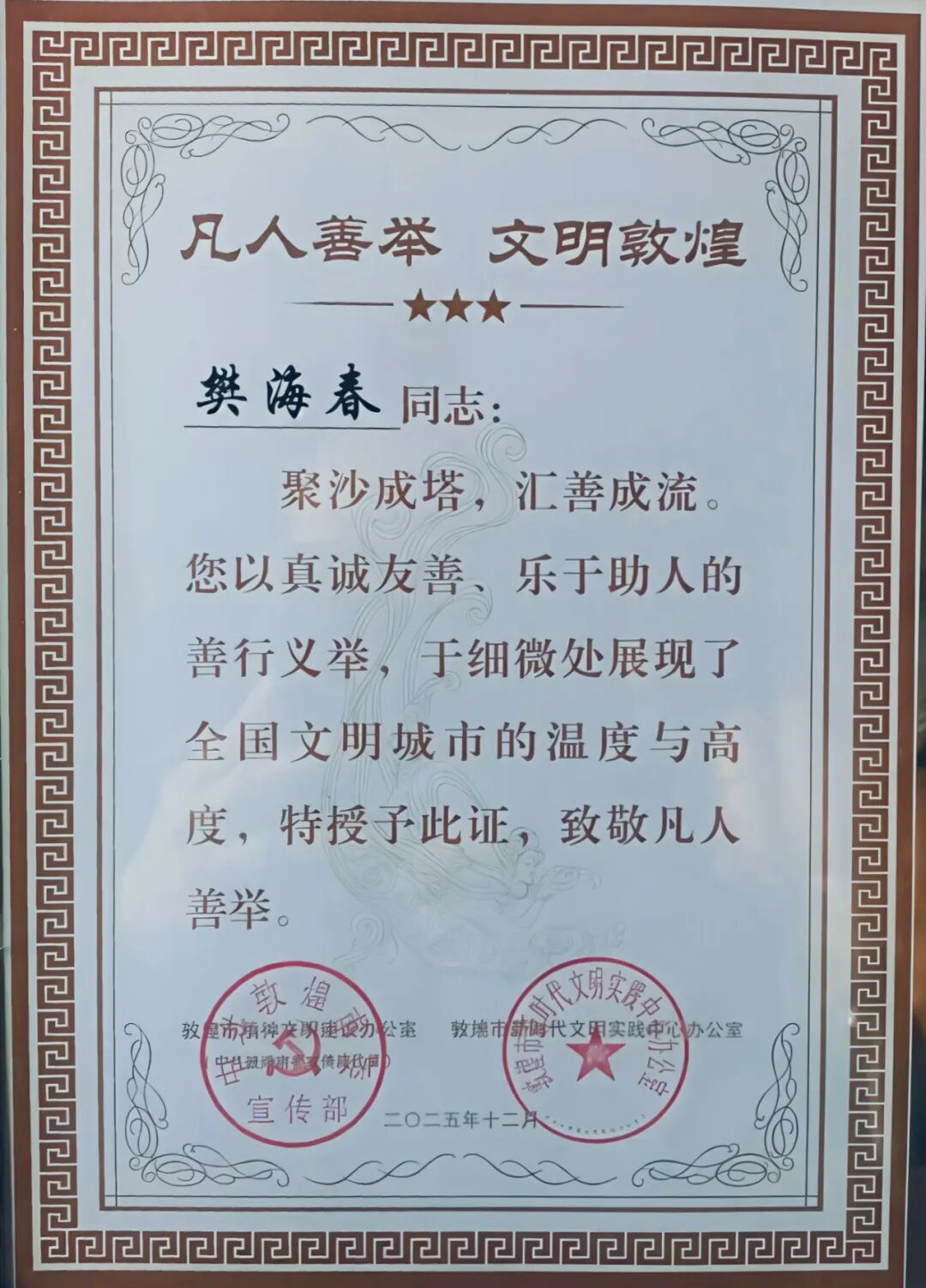 1月29日深夜,樊海春为返程游客紧急更换爆胎,寒夜中忙碌至游客安全启程;9月13日,他路遇车辆故障,迅速疏导交通并更换备胎,保障景区通行顺畅;9月16日,他协助韩国游客寻找遗失护照,联动民警沿游览路线排查,最终成功找回,用行动搭建起跨国友谊桥梁。从深夜救援到路遇相助,从跨国寻物到日常守护,樊海春没有惊天动地的壮举,却在平凡岗位上用热忱与专业,让每一位游客感受到家一般的温暖。此次获评“凡人善举·文明敦煌”荣誉,既是对他个人坚守的认可,更是对敦煌文旅人“以游客为中心”服务理念的肯定。