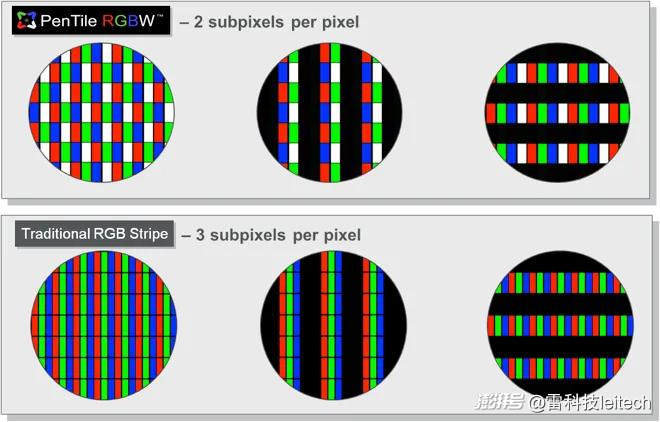 RGB-OLED和常见的Pentile钻石排列(P排)有着明显的区别,这种结构确实是 RGB发光,但每个像素并不是独立完整的红、绿、蓝三色,更多时候是两个像素共用一个蓝色,或者让绿色数量比红蓝多。