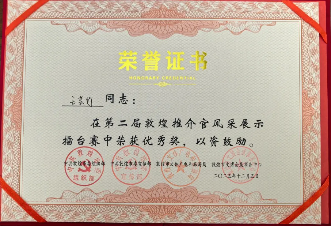 经过多轮激烈角逐,王芸竹凭借出众的综合实力脱颖而出,最终斩获本次擂台赛优秀奖!这份荣誉,既是对她个人专业能力的高度认可,更是敦煌雅丹国家地质公园深耕文化旅游服务、助力敦煌品牌推广的生动缩影。作为全国科普教育基地的一员,王芸竹日常工作中便坚守在旅游服务与文化传播一线,为游客讲解雅丹地貌形成原理、组织 “指尖雅丹” 研学活动、助力天文观测科普推广,用点滴行动将雅丹的神奇与壮美传递给每一位来访者。