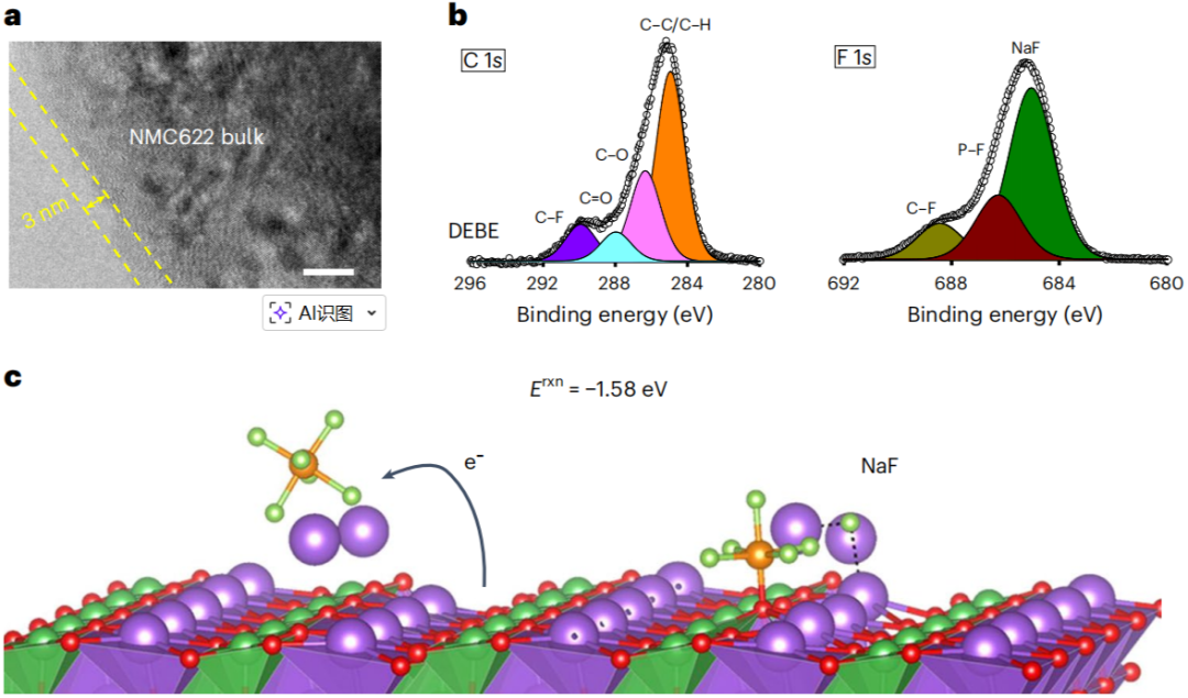50圈循环后,DEBE与DETE均在NMC622表面形成NaF为主的CEI(~3~4 nm),其中DEBE因盐聚集增强而NaF含量更高,该CEI与正极结合弱,可阻止电解液渗透,提升循环寿命。DFT以NaNiO2为模型表明,DEE易在正极表面脱氢并裂解产气,加速层状→岩盐相变,而DBE的叔丁基位阻及给电子效应抑制溶剂分解。计算还发现[Na2PF6]+可在富镍表面还原(−1.58 eV),DEBE中增强的盐聚集促进生成薄而NaF富集的CEI,与实验一致,并优化Na+扩散。