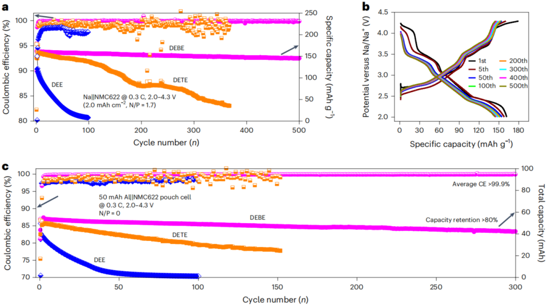 DEBE电解液在>4.8 V下稳定,可与NMC622高镍正极匹配。Na||NMC622扣式电池(2 mAh cm-2,4.3 V)中,DEBE首效90.1%,500圈容量保持80.9%,CE >99.9%。DETE因TTE分解200圈后仅剩45.8%,DEE因正极稳定性<4.2 V 50圈即失效。50 mAh无负极 Al||NMC622软包电池在DEBE中 4.3–2.0 V深度循环300圈,容量保持>78%,CE >99.9%,能量密度>360 Wh kg-1,首次实现高压无负极SMB,为低成本、可持续钠电池替代锂电奠定基础。