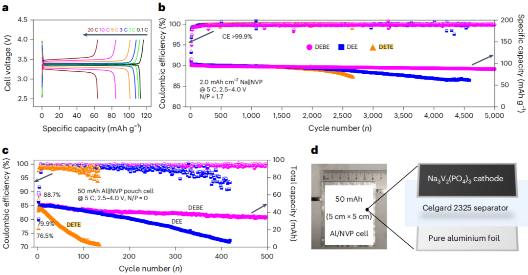 Na||NVP扣式电池(2 mAh cm-2)中,DEBE电解液5 C下循环5000圈容量保持率>83%,CE >99.9%,20 C仍输出63.65 mAh g-1。对比之下,DEE因高压不稳定2500圈后衰减,DETE 因Na CE仅98.5%在2700 圈失效。EIS显示DETE界面阻抗激增,DEE形成高阻抗有机CEI。DEBE兼具2.4 mS cm-1电导率、0.4 Na+迁移数及NaF富集界面,使50 mAh无负极 Al||NVP软包电池500圈保持>75%,比能量>230 Wh kg-1,DEE 420圈失效,DETE50圈容量损失>50%。
