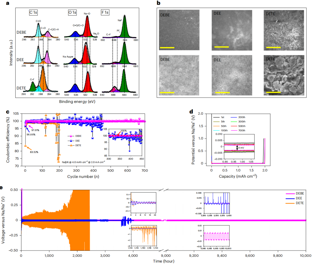 图3. 钠金属负极在不同电解液中的电化学性能。