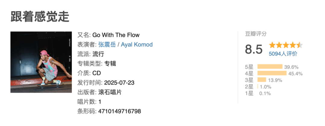 张震岳新专辑《跟着感觉走》,豆瓣评分8.5。(图/豆瓣截图)