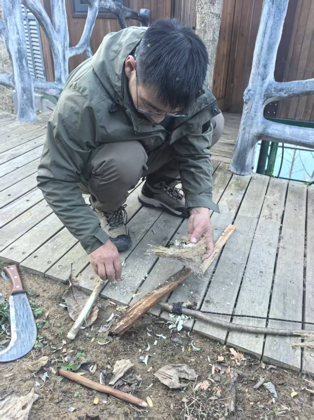 休整的头两天,活动比较多,家乡文旅局的领导也来了,但我还是一有空就让他学习荒野技能,比如说哪些能吃哪些不能吃,还有练习钻木取火。后来,他手脚消肿了些,又请教了四位老师,第二天就取火成功了。第三天又继续练习,后面他几乎一把就能钻出火来。钻木取火看起来挺容易的,其实真正上手之后才知道它不仅需要技巧,还特别耗体力,你不把力气用光,它是生不起的。