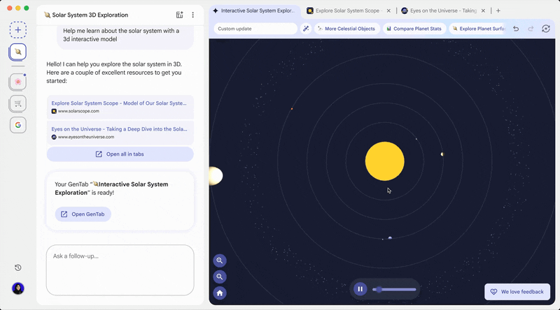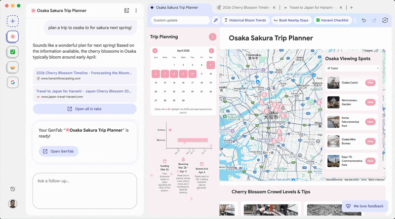 除了类似其他 AI 浏览器的对话式设计,Disco 最引人注目的亮点,就是一个名为 GenTabs 的新机制,Google 将其称为「Disco 的首个网络发现功能」,也在暗示未来更多的功能更新。