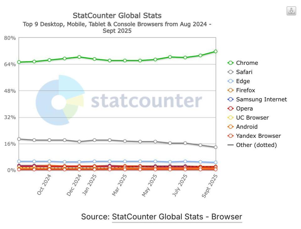 问题或许不在于 Google 做不到,而在于它不愿意在 Chrome 上轻易冒险。StatCounter 数据显示,Chrome 今年的全球浏览器市场份额已经创纪录地突破了 70%,相比创业公司可以通过「不断创新」快速试错,作为「全球级」产品的 Chrome 不管从舆论还是业务本身都不太可能「激进」。