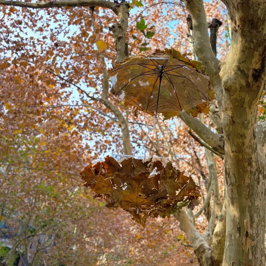 漫步浦东乳山路、桃林路的街道,一棵棵粗壮的梧桐树间,被各种“落叶手作”装点得趣味十足。落叶雨伞、拍照相框、落叶蝴蝶、枯叶小球、树叶小熊,与地上飘落满地梧桐叶相映成趣,每走一步都有出片瞬间。