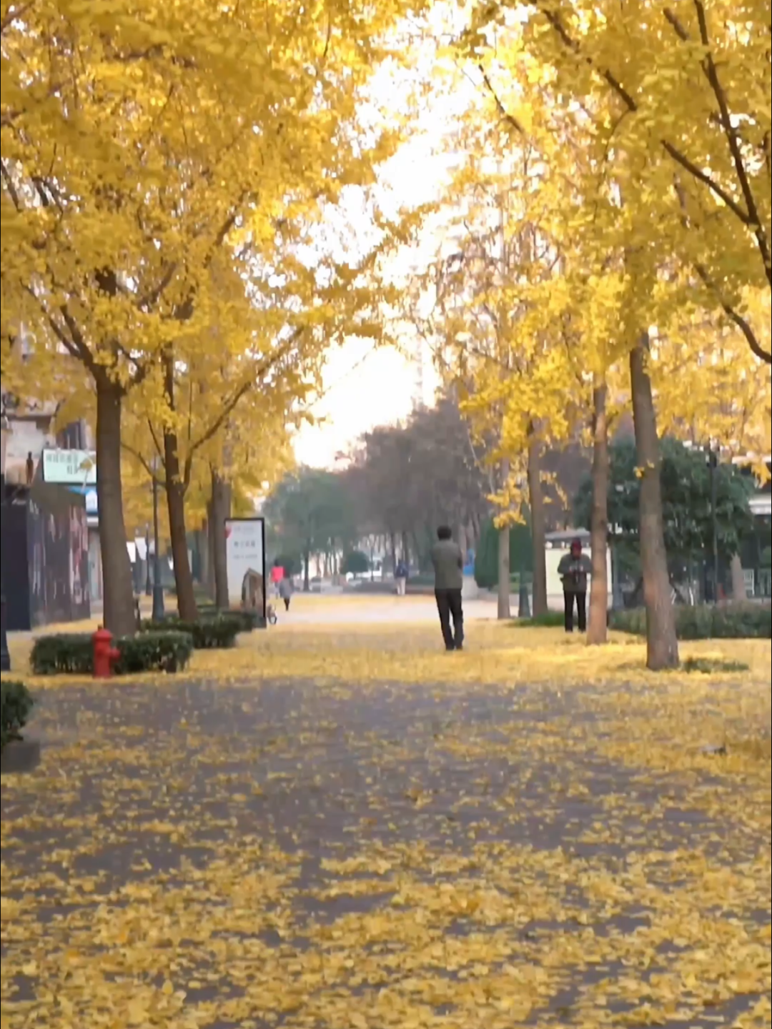 阎华入镜的黄金城道,堪称银杏“高光时刻”的完美具象,树上片片黄叶被西风精心着色,以碧空白云为底,晕染金色的梦境。被风吹落的银杏叶一层叠着一层,漫步满地金黄之上,每一步都松软轻盈,仿佛踏进时光的温柔。