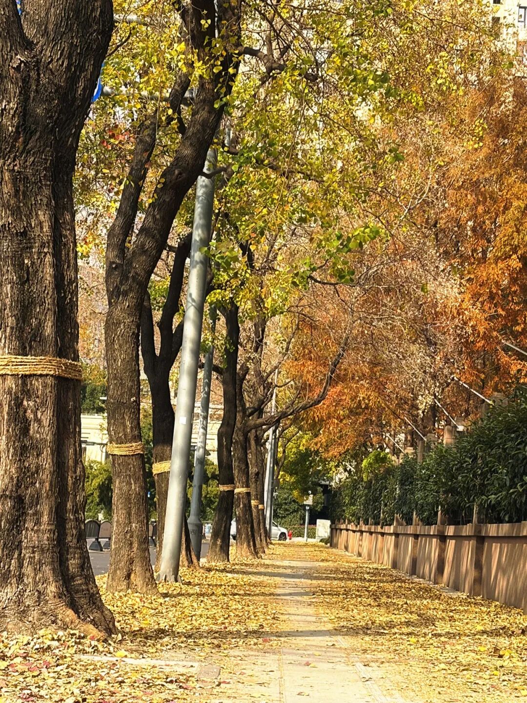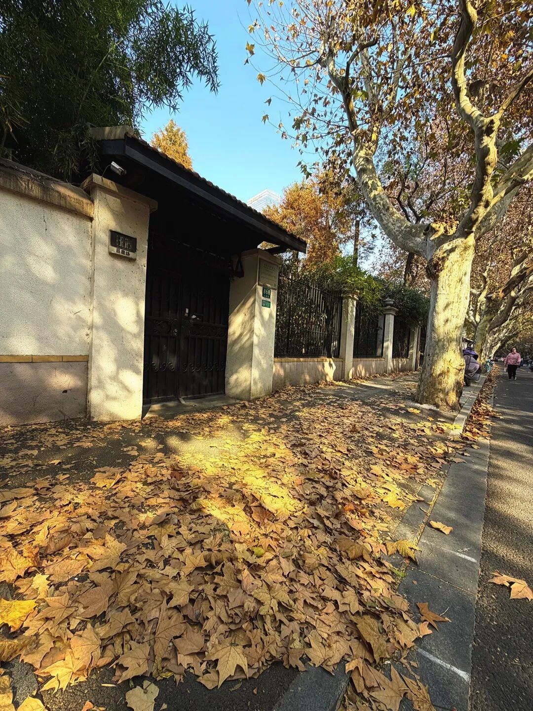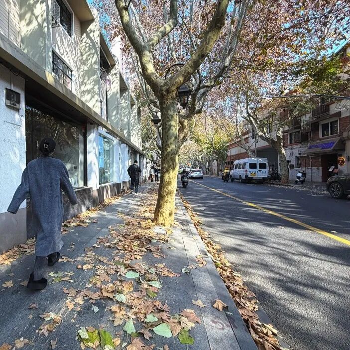 这里车辆人流稀疏,因此显得宁静而深邃。落叶不扫,枯萎的梧桐叶随风飘落,在街道上跳跃舞动,与行人的脚步缠绕碰撞、簌簌作响,是秋日旋律中的最佳节拍。