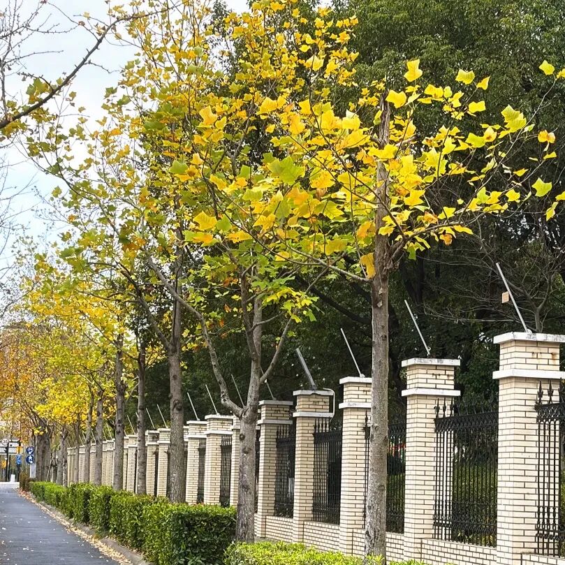 新江湾城区域的清波路两旁的鹅掌楸常常让人与梧桐“傻傻分不清”,但是仔细辨认会发现,入秋后的树叶颜色和比梧桐更显橙黄色,单片树叶的形状更是像鹅掌一样萌萌哒。