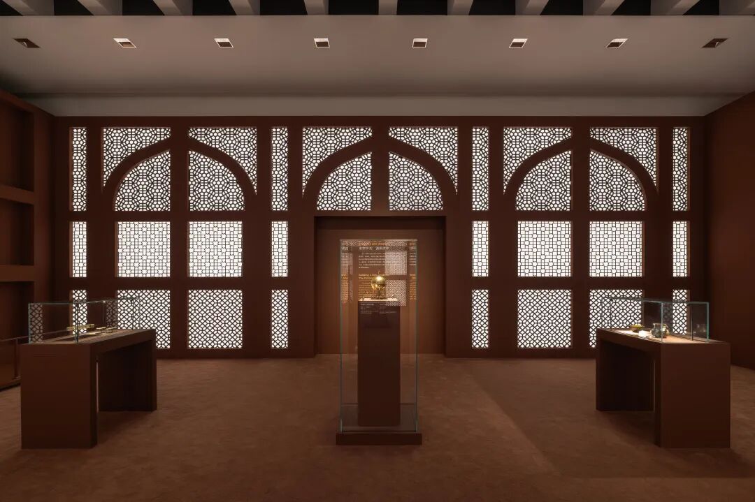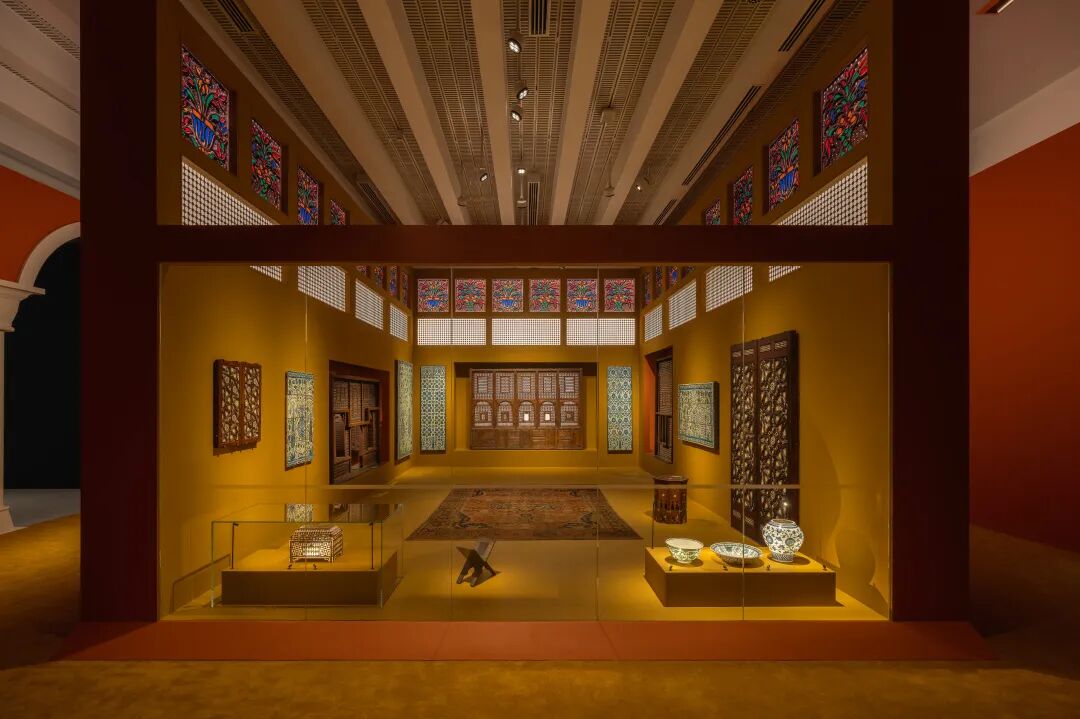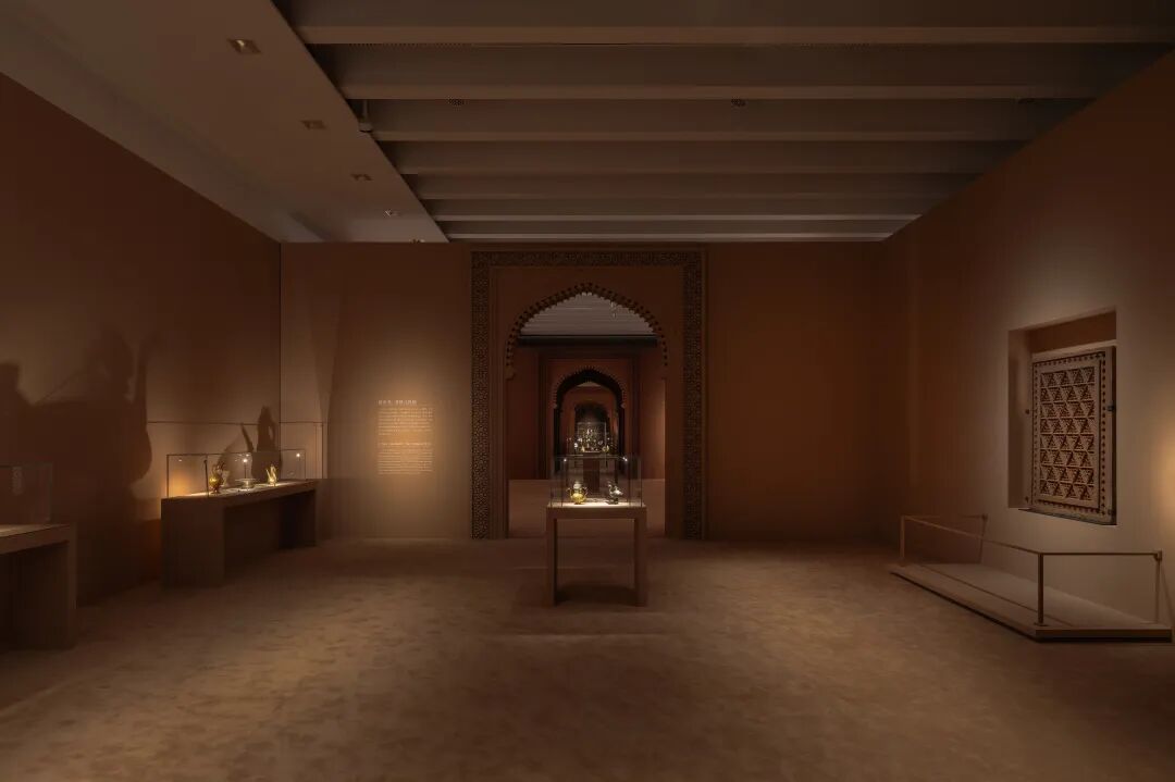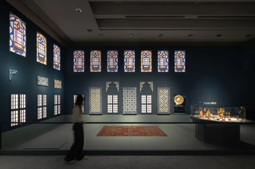 一处是对托普卡帕宫第三庭院的艾哈迈德三世图书馆的局部复刻,另一处是奥斯曼时期开罗府邸Al-Suhaymi中标志性的 Takhtabush 厅室空间。当这些地毯、器物、家具、“Mashrabiyyas”窗屏在模拟空间中复位组合,即使不阅读展签观众也能大致理解展品的内涵与功用。