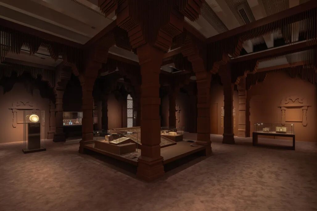 这次的展览将聚焦于印度、伊朗、奥斯曼三种文化背景下的伊斯兰艺术成就。因此展陈设计也将围绕这三个篇章展开,我希望在结合展陈作品的同时,能够通过不同的建筑元素:印度的宫殿、伊朗的花园、奥斯曼的庭院与厅室……来营造出三种截然不同的氛围,彰显不同地域伊斯兰艺术的独特性,印度展区主要从莫卧儿帝国时期印度民族传统和波斯艺术结合而形成的独特风格中提取意象,融入了许多当时印度宫殿中常见的建筑元素。展厅主体被设计为一座拱廊,通过展厅中的明暗变化与尽端的镜面来进一步拓展空间的纵深感。