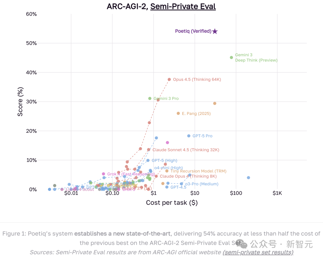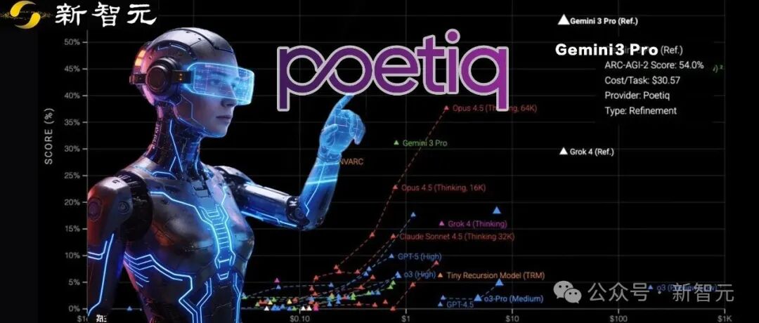 由Poetiq推出的Gemini 3 Pro优化技术,在ARC-AGI-2 leaderboard上创下新SOTA,得分高达54%,每任务计算成本仅31美元。