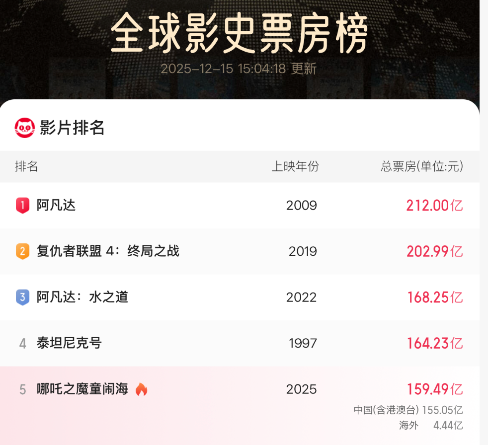 《阿凡达:火与烬》是由詹姆斯·卡梅隆执导的科幻电影,是《阿凡达》系列的第三部。全球影史票房显示,《阿凡达》第一部总票房212亿元排名第一,《复仇者联盟4:终局之战》总票房202.99亿元排名第二,《阿凡达:水之道》总票房168.25亿元排名第三。前三名中,《阿凡达》系列已独占两席。