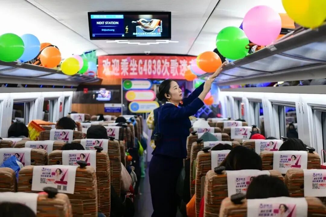 三是多措并举赋能冰雪经济。随着雪季到来,铁路部门推行一系列便民利民惠民服务举措,服务旅客畅享冰雪旅游和冰雪运动,助推冰雪经济持续升温。北京局集团公司在京张高铁试点推出“雪具便利行”服务,旅客线上预约成功后可随车携带雪具并存放在列车指定位置,实现人和雪具随车同行,“坐着高铁去滑雪”将更加方便快捷。同时,每周末增开京张高铁崇礼方向高峰线列车10列,“星光·燕赵号”旅游列车新增张家口、宣化等站点,串联优质冬季旅游资源,有效满足雪季周末出游需求。哈尔滨局集团公司积极适应冬季旅游市场需求,对“悠享龙江·银旅号”“大兴安岭号”“伊春号”等品牌旅游列车进行优化升级,提供特色旅拍、非遗文化互动等别具特色的冬季旅行体验。沈阳局集团公司加开多趟长春至北京、松原、长白山等方向的旅客列车,并对吉林至北京朝阳的G928次、长春至乌兰浩特的C503次等列车实施重联运行,延吉西、珲春等车站备有姜茶、暖贴、冻伤膏等防寒物资,为旅客驱散寒意,长白山站设置“暖暖屋”,供旅客在舒适环境中更换衣物。呼和浩特局集团公司乌兰察布、集宁南、兴和北等车站优化冰雪游研学团体进出站流程,开辟绿色通道、安排候车专区,为雪具开辟专用安检通道,营造方便、温馨的出行环境。乌鲁木齐局集团公司开行夕发朝至的“冬恋喀禾”旅游专列,旅客可实现“昼游夜行”,方便游览“中国雪都”阿勒泰及喀纳斯、禾木等地的冰雪风光,车上设雪具存放区,为滑雪爱好者提供便利。