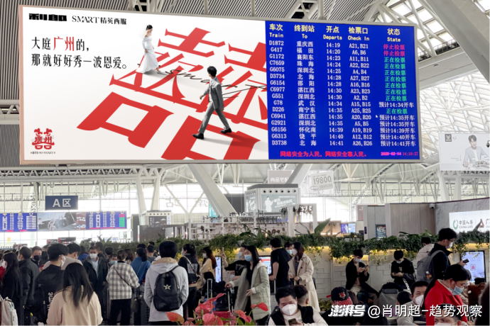 今年情人节,利郎敏锐捕捉“婚礼季”背后深厚的情感势能,以 “为爱,回一趟家乡” 为核心叙事,成功实现了一次与年轻消费者深度共鸣的场景营销破圈。品牌联动泉州、郑州、长沙等33座城市,创作了一系列极具地方特色的“家乡版结婚照”。每组影像均巧妙化用城市名称谐音,衍生出如 “泉(全)心泉意”、“郑(真)好有你” 等既契合在地文化、又饱含深情巧思的文案,将城市符号转化为品牌情感表达的创意载体。在传播层面,利郎以国民出行枢纽——高铁站为关键情绪触点,借助永达传媒的高铁大屏,在全国33城进行集中投放。这些融合了家乡情怀与爱情宣言的视觉内容,在旅客匆匆的行程中形成了强烈的情感驻足,成功激发打卡分享,实现了从线下场景的“情感引爆”到线上社交的“自发扩散” 的完整闭环,为行色匆匆的日常通勤注入了浪漫叙事。