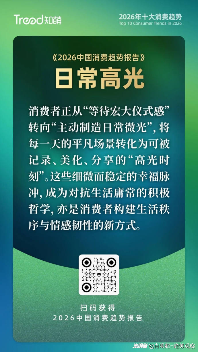知萌咨询机构经过深度的研究,预见了2026年将会呈现的10大消费趋势,分别是:理感共生、品质精算、心灵游牧、日常高光、共感体验、在地潮生、内行主义、健康调频、品牌共识、AI场景力。
