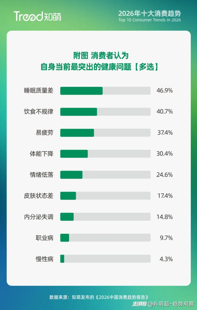 知萌趋势研究显示,46.9% 的消费者正被睡眠问题困扰,饮食不规律与易疲劳感紧随其后。社交媒体上流行的 “职场脆脆鲨”、“低精力人群” 等热梗,实则是当代人集体健康焦虑的真实映照。超过七成消费者认为,“心态积极、精力充沛” 才是真正的健康状态,健康被重构为一种需要每日维护与投资的 “状态资产”。