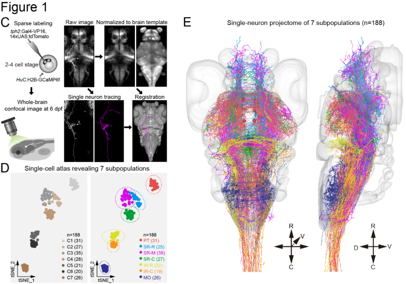 研究者首先建立单细胞水平的全脑介观神经投射图谱并进行形态学聚类分析,将全脑5-HT神经元分为七个不同的亚群(Figure 1C, D),每个亚群都有独特的轴突投射模式及胞体空间分布(Figure 1 E)。
