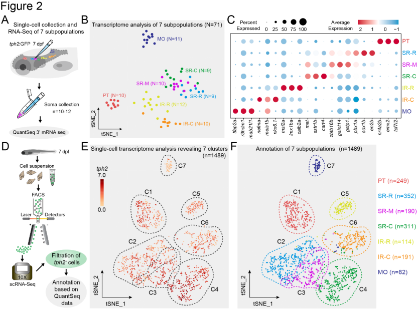 研究者通过建立两个独立的单细胞转录组数据库进一步探究了不同5-HT亚群分子特征的差异。基于上述分群依据,首先进行single-cell RNA-Seq单细胞转录组分析(Figure 2A, B),差异表达分析表明,每个亚群体表达一组特征基因,不同亚群间具有不同的遗传特征(Figure 2C)。随后,对全脑5-HT神经元进行10×scRNA-seq单细胞转录组分析,也可分为七个亚群(Figure 2D, E),将两个数据库鉴定的特征基因进行比对和注释,表明七个5-HT神经元亚群具有遗传异质性(Figure 2F)。