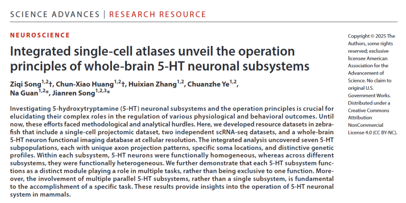2025年12月12日,同济大学医学院/附属上海市第四人民医院宋建人团队在Science Advances杂志上发表了题为“Integrated three single-cell atlases unveil the operation principles of whole-brain 5-HT neuronal subsystems in zebrafish”的研究成果。该研究以斑马鱼为实验模型,通过对投射、转录和功能图谱的综合分析,发现全脑内存在七个5-HT神经元亚群。每个5-HT亚群作为独立的功能模块,参与多种生理或行为过程;此外,完成特定任务需要多个平行的5-HT亚群的协调参与。该研究不仅解析了全脑5-HT神经元系统调控生理和行为状态的运行原理,也为5-HT功能障碍相关疾病的治疗策略提供了新思路。