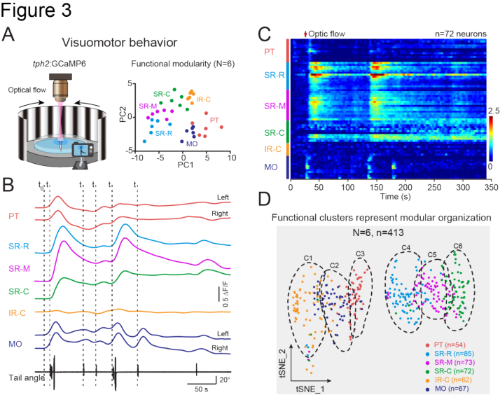 5-HT系统可参与调控多种行为状态。研究者采用双光子功能成像结合高速摄像和行为追踪,探究了多种行为范式下5-HT系统的运行原理。以视觉运动行为为例,每个亚群具有不同的响应模式(Figure 3A, B),每个亚群中的神经元形成一个独立的5-HT子系统,并显示出模块化的组织运行模式(Figure 3C, D)。不同的行为状态需要多个并行的5-HT子系统共同协调参与。