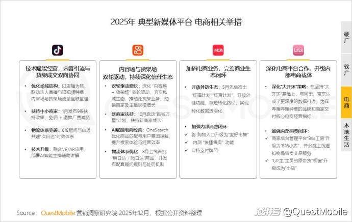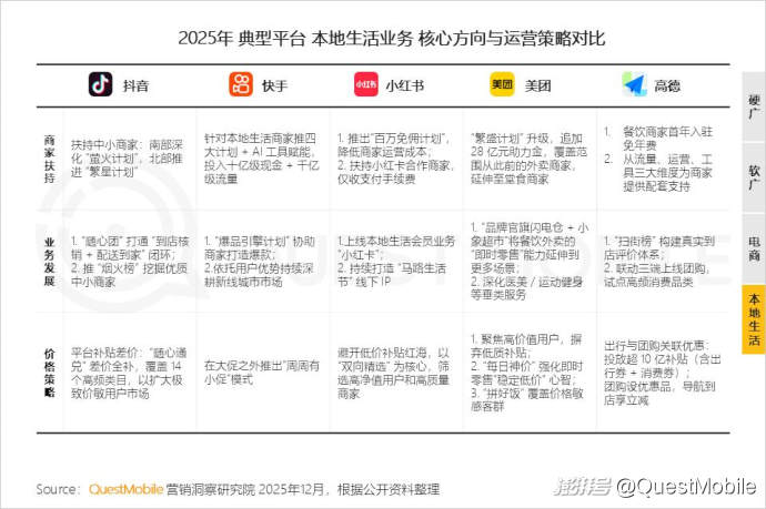 抖音/快手依靠内容与流量优势,主打补贴与爆品,AI助力经营;小红书走 “双向精选”的品质调性;美团则强化其 “交易履约”固有护城河,聚集高价值用户,高德则以“位置服务”顺势入场。