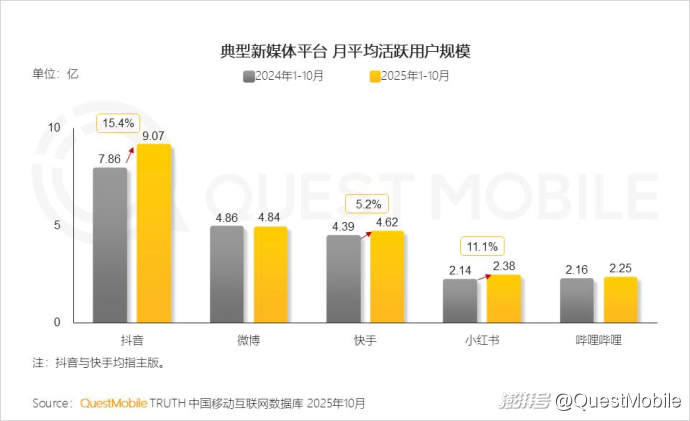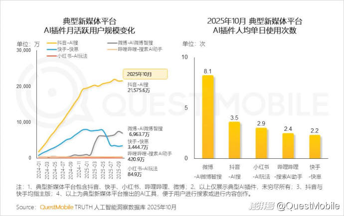 QuestMobile数据显示,2025年10月抖音、微博、快手平台AI插件月活跃用户规模超三千万。