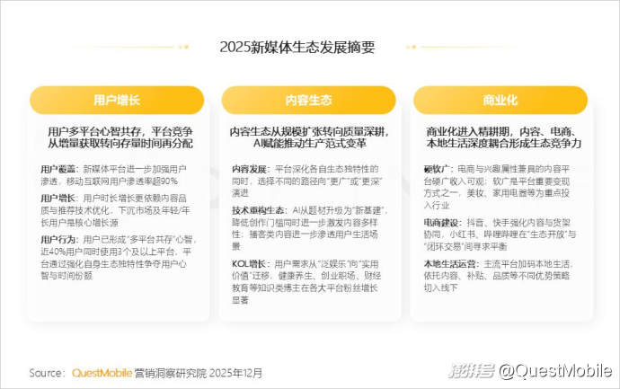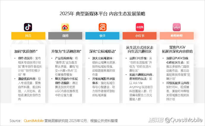 哔哩哔哩、小红书持续从垂直社区“破圈生长”,拓宽内容与用户边界;而抖音、快手则从全民应用转向“精耕细作”,从流量到“留量”,微博从“看热点”的地方,变为“过生活”的地方,其共同目标是构建一个更具活力、更可持续的内容与商业生态。