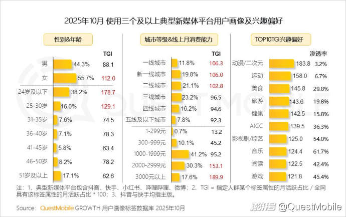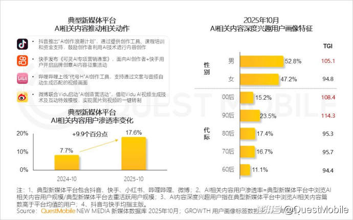 QuestMobile数据显示,2025年10月AI相关内容用户渗透率同比增长9.9个百分点,且深度兴趣用户呈年轻化、男性略多特征。