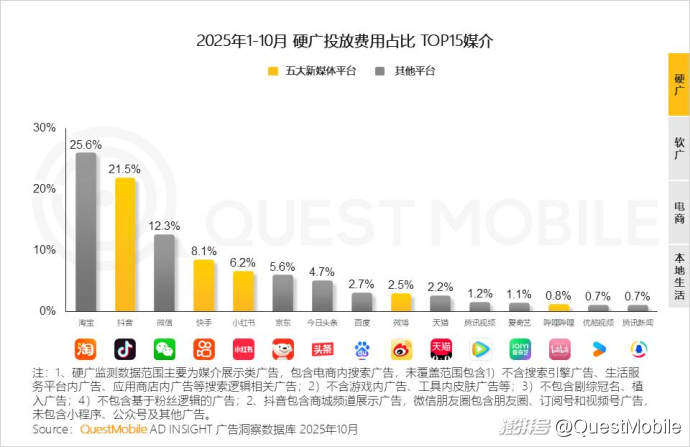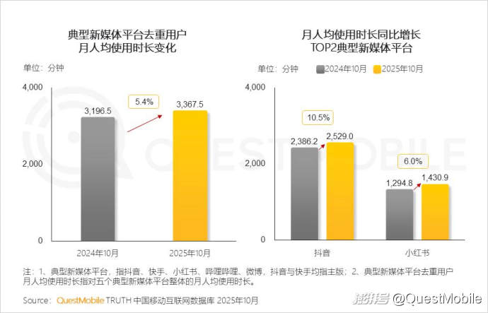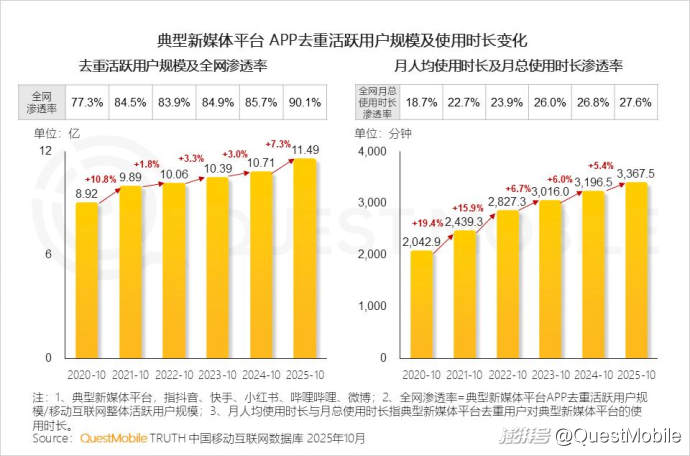QuestMobile数据显示,截止到2025年10月,典型新媒体平台APP去重活跃用户规模及月人均使用时长分别为11.49亿、3367.5分钟,同比分别增长了7.3%和5.4%,显示出在多元化内容形态和算法推荐技术加持下,新媒体平台用户粘性仍在稳步提升。