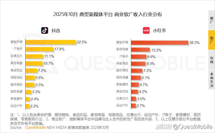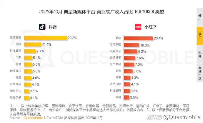 抖音软广收入最高的是“剧情搞笑” ,映射着其将广告无缝接入娱乐场景的能力是重要变现方式。小红书则是“美妆”类KOL占主导,与其女性占比较高的用户特征相契合。