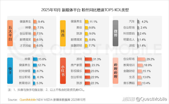 此外,职场、教育等知识类KOL的兴起,映射着用户对新媒体平台的需求,正从 “消磨时间”向“投资自我”与“提升效率” 迁移。