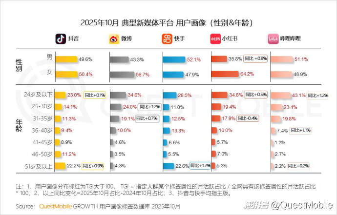 具体来看,各平台间差异化竞争格局已经相对稳定:短视频、长视频社群、资讯社区各有用户圈层。2025年10月,微博、小红书、哔哩哔哩30岁以下用户占比分别为58.6%、54.2%、66.5%,年轻化特征非常明显,相比之下,抖音、快手51岁及以上用户占比分别达到22.2%、22.6%。