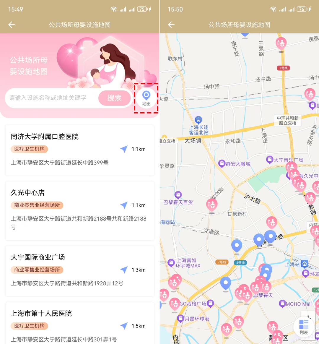 点击地图按钮,可以按照地图的形式搜索附近的公共场所母婴设施。