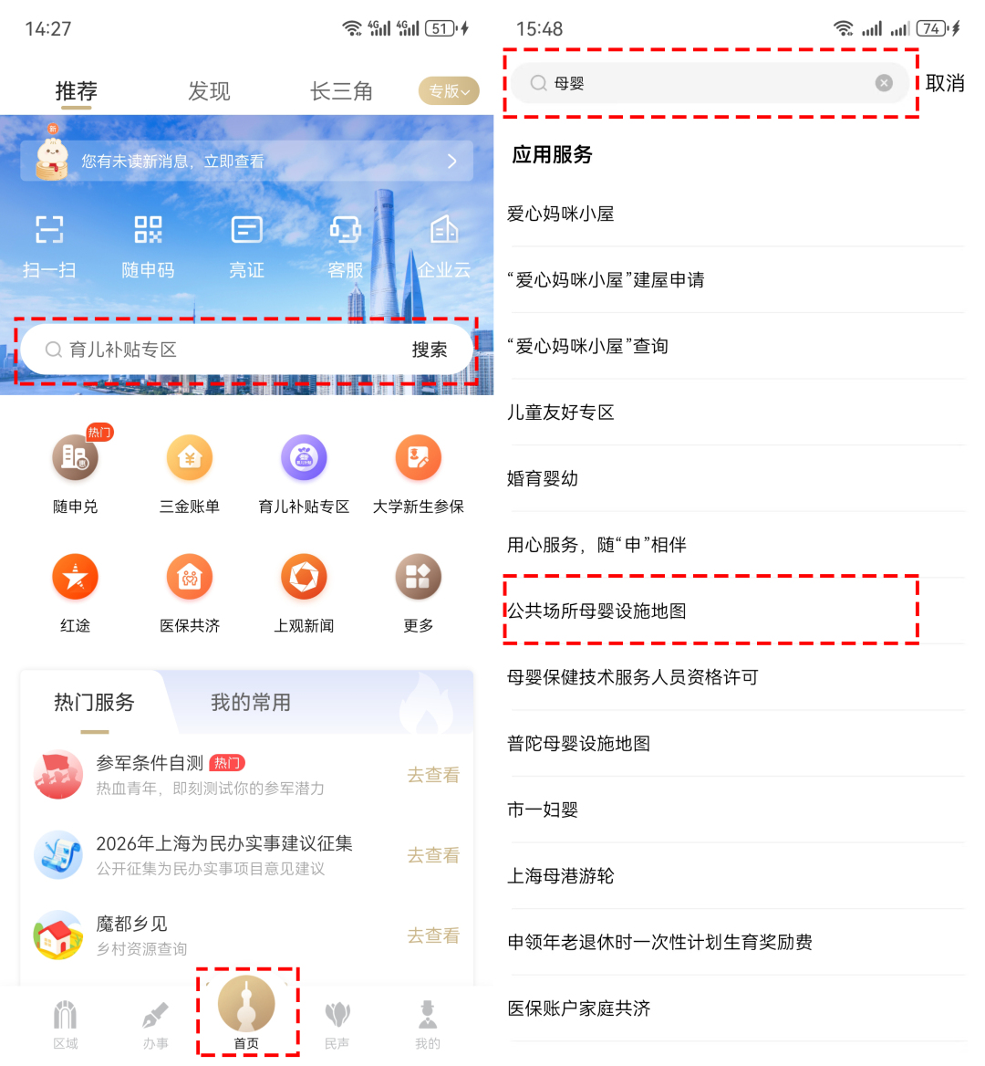 登录“随申办市民云”APP→首页搜索关键字“母婴”→点击“公共场所母婴设施地图”,点击服务页面;