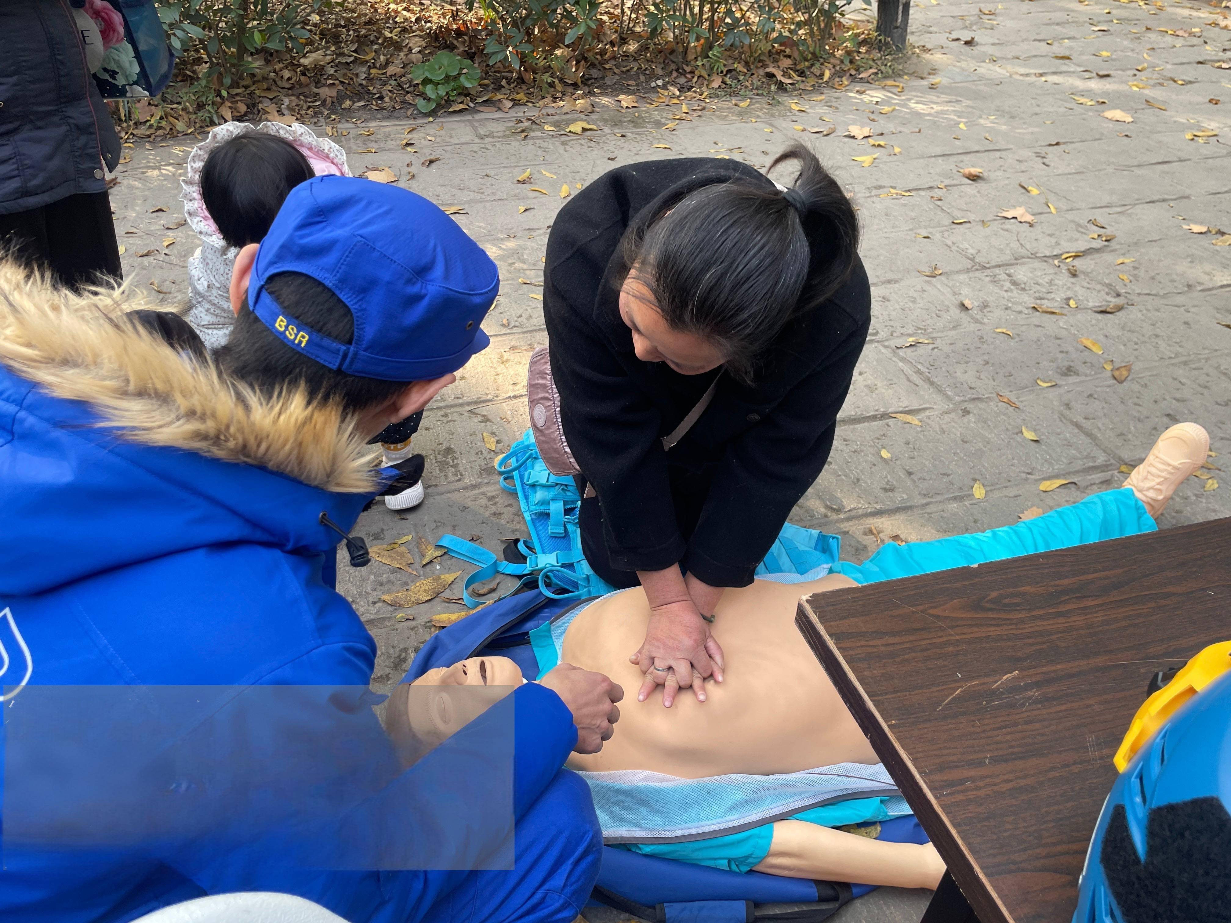 活动内容设计系统且注重实操,救援队队员通过专业演示与一对一指导,确保关键技能的有效传递。在心肺复苏(CPR)环节,队员利用专业模型,清晰展示了“30次按压配合2次人工呼吸”的国际标准流程。参与者随后在指导下进行实操练习,队员现场纠正按压姿势、深度与频率,确保动作规范。