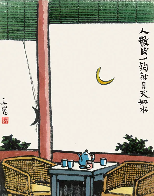 丰子恺公开发表的第一幅漫画作品《人散后,一钩新月天如水》,发表在朱自清、俞平伯合编的《我们的七月》上