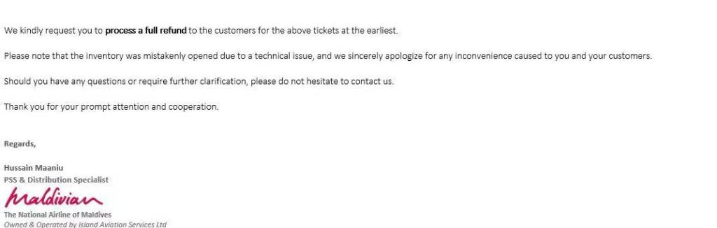 12月17日,澎湃新闻询问了相关售票平台。一平台内部人士表示,马尔代夫航空公司通知平台1月执飞的多个航班出现超售,涉及Q2394、Q2395、Q2397等航班,政策为全额退票,无其他补偿。据平台相关人士提供给澎湃新闻的来自马尔代夫航空公司的邮件显示:“我们恳请您尽快为上述机票向客户办理全额退款,由于技术问题,库存被错误打开,我们对此给您和您的客户造成的不便深表歉意。如果您有任何疑问或需要进一步澄清,请随时与我们联系。”