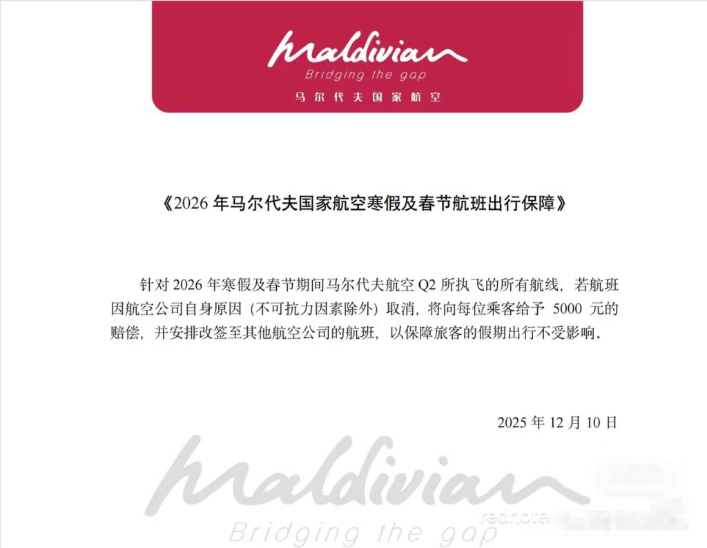 澎湃新闻注意到,在社交平台上,有多位网友曾发布一张疑似马尔代夫航空公司的官方声明,显示:针对2026年寒假及春节期间马尔代夫航空Q2所执飞的所有航线,若航班因航空公司自身原因(不可抗力因素除外)取消,将向每位乘客给予5000元的赔偿,并安排改签至其他航空公司的航班,以保障旅客的假期出行不受影响。