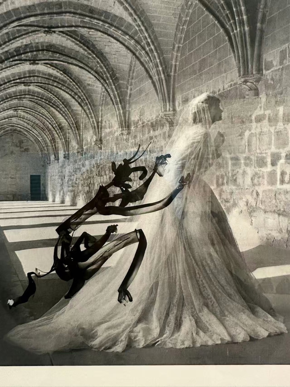 转而,一条通道中,毕加索在杂志时尚版面上随手画下小幅漫画和速写,用自己的笔触“补充”或“改写”原本的时尚图像(如给杂志封面的模特添上了一顶帽子、在穿着婚纱的女性身后画一些小怪物),让人想到自己的少年时代,也曾在课本上这样画着。