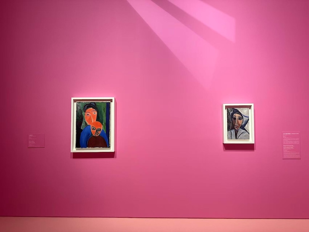 展览现场,“粉红女子:《阿维尼翁的少女》之序幕”板块,右为《女人或水手胸像》(《阿维尼翁的少女》研习稿),展墙上还模拟了阿维尼翁的阳光。