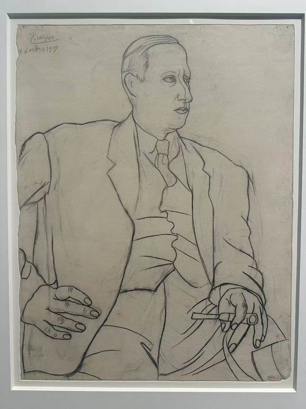 展览现场,毕加索1919年铅笔作品《安德烈·德兰肖像》。德兰与马蒂斯共同开创野兽派,后回归古典创作。