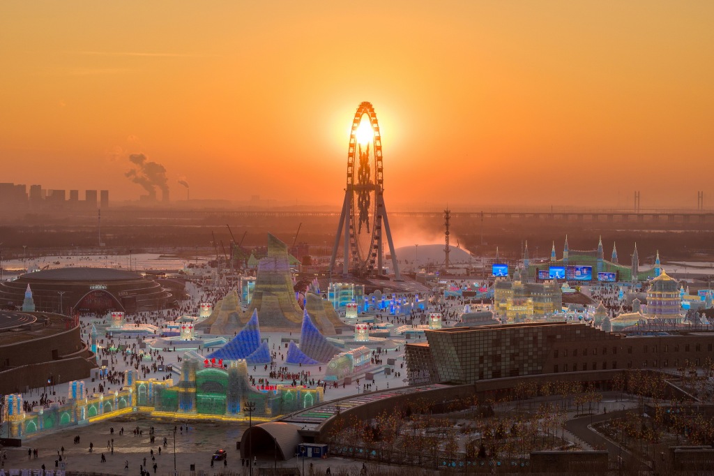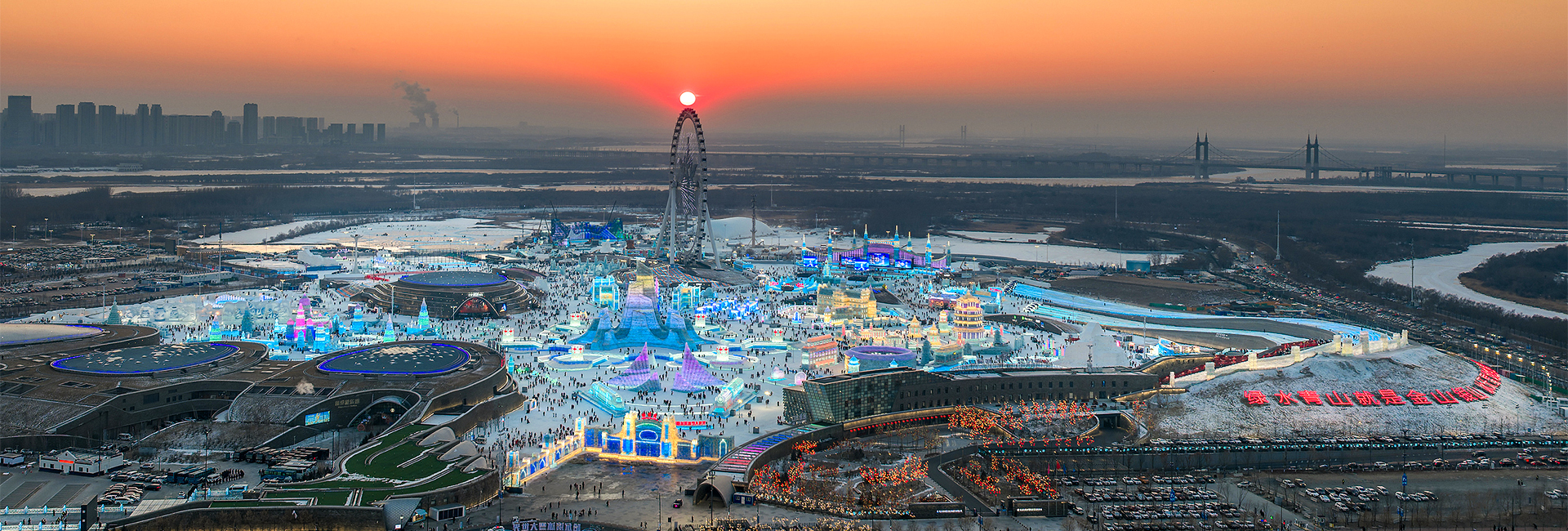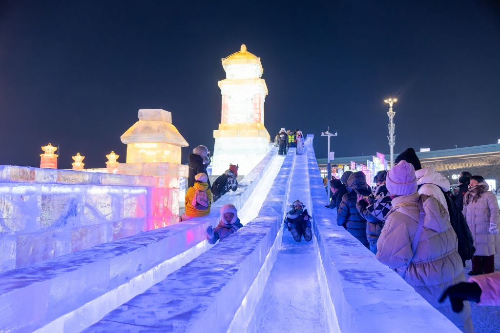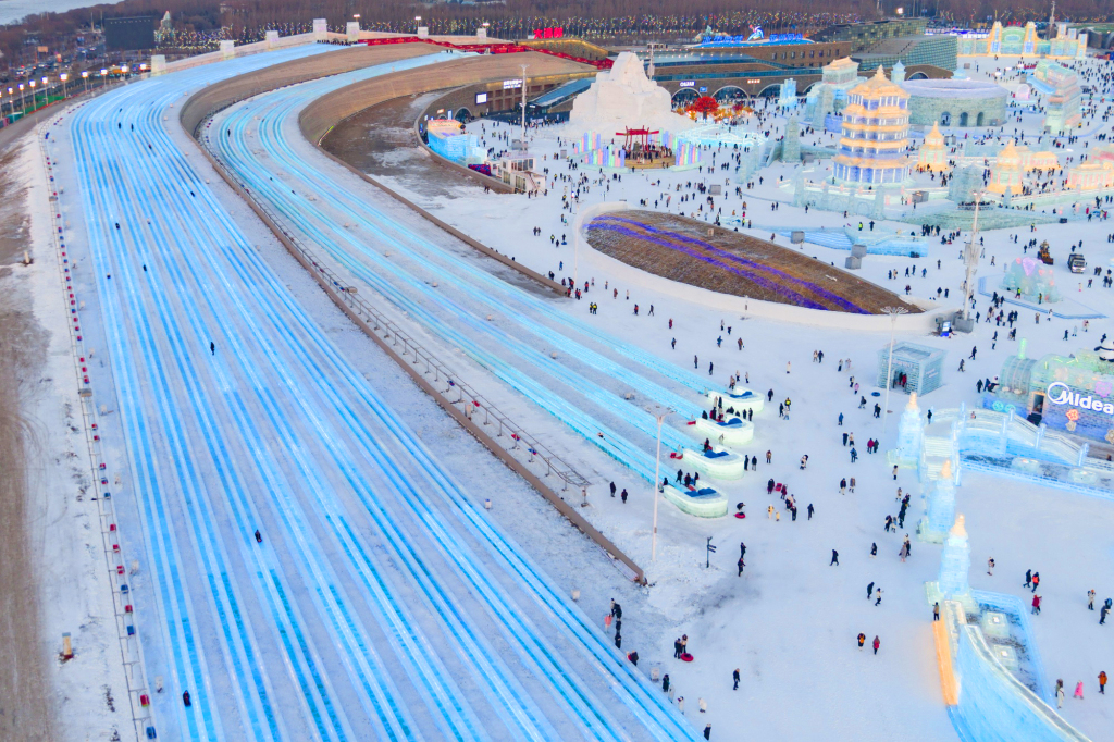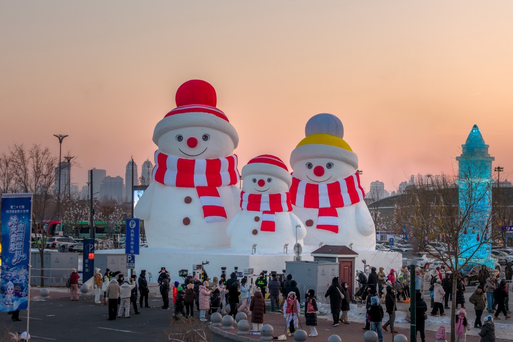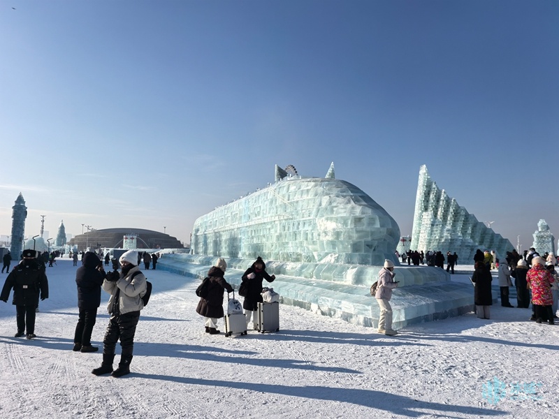 园区的“红色门面”同样吸睛。本届冰雪大世界主形象大门以哈尔滨火车站为原型打造,红彤彤的“哈尔滨”三个大字醒目矗立,如同张开的热情臂膀,迎接八方来客共赴冰雪之约。