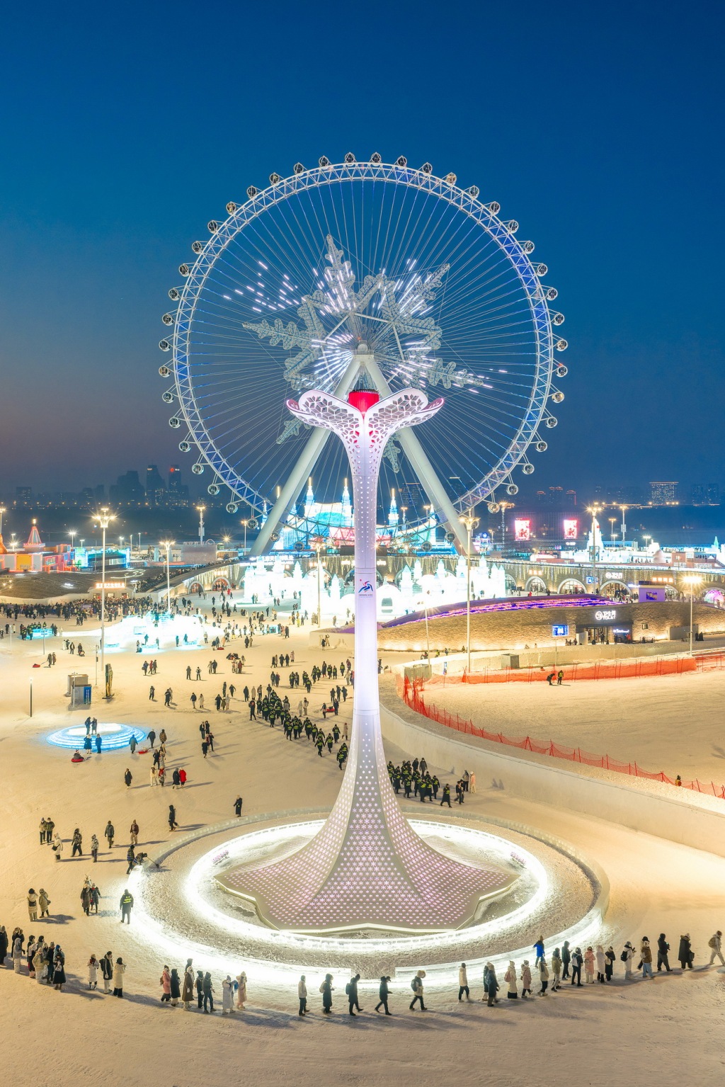 12月17日,哈尔滨冰雪大世界园区内高达120米的雪花摩天轮。