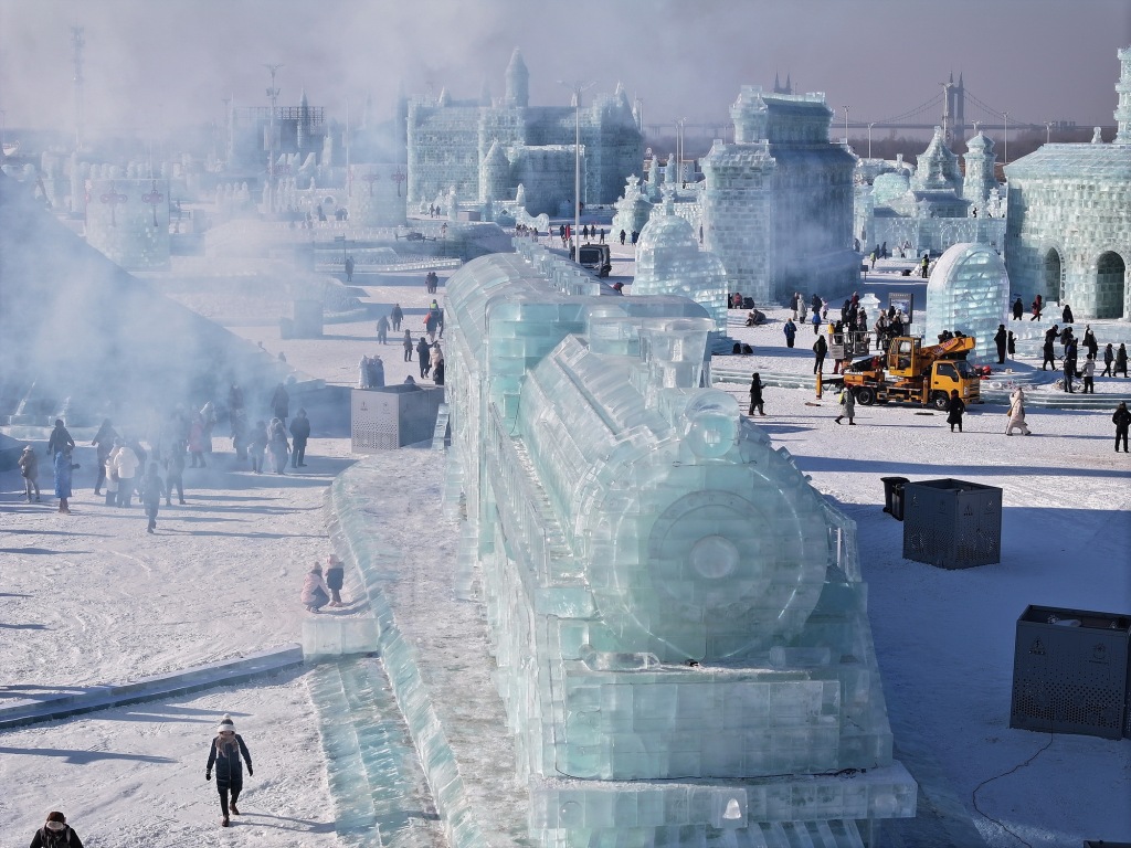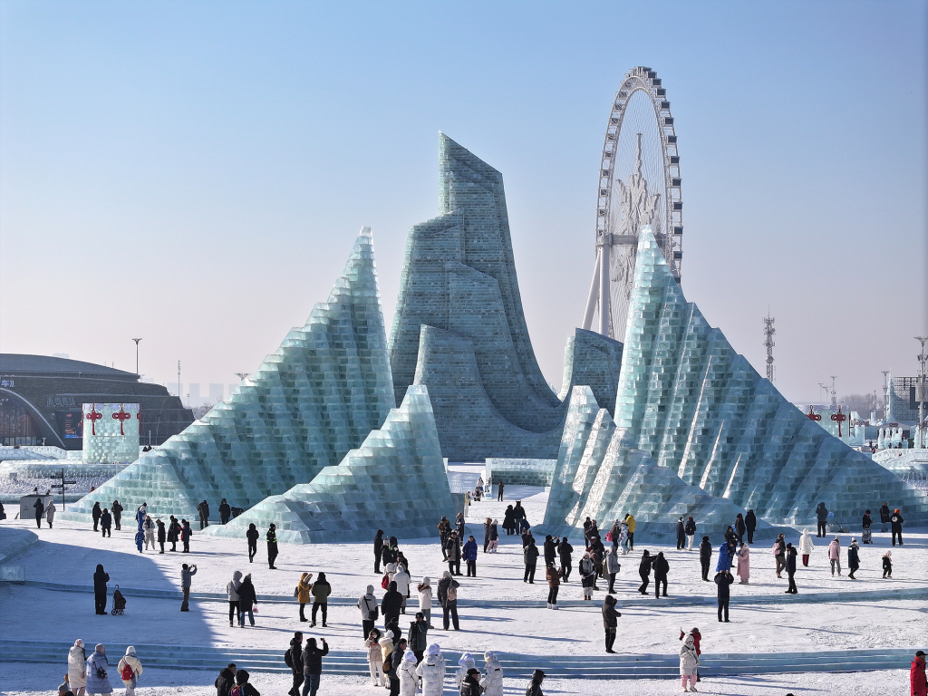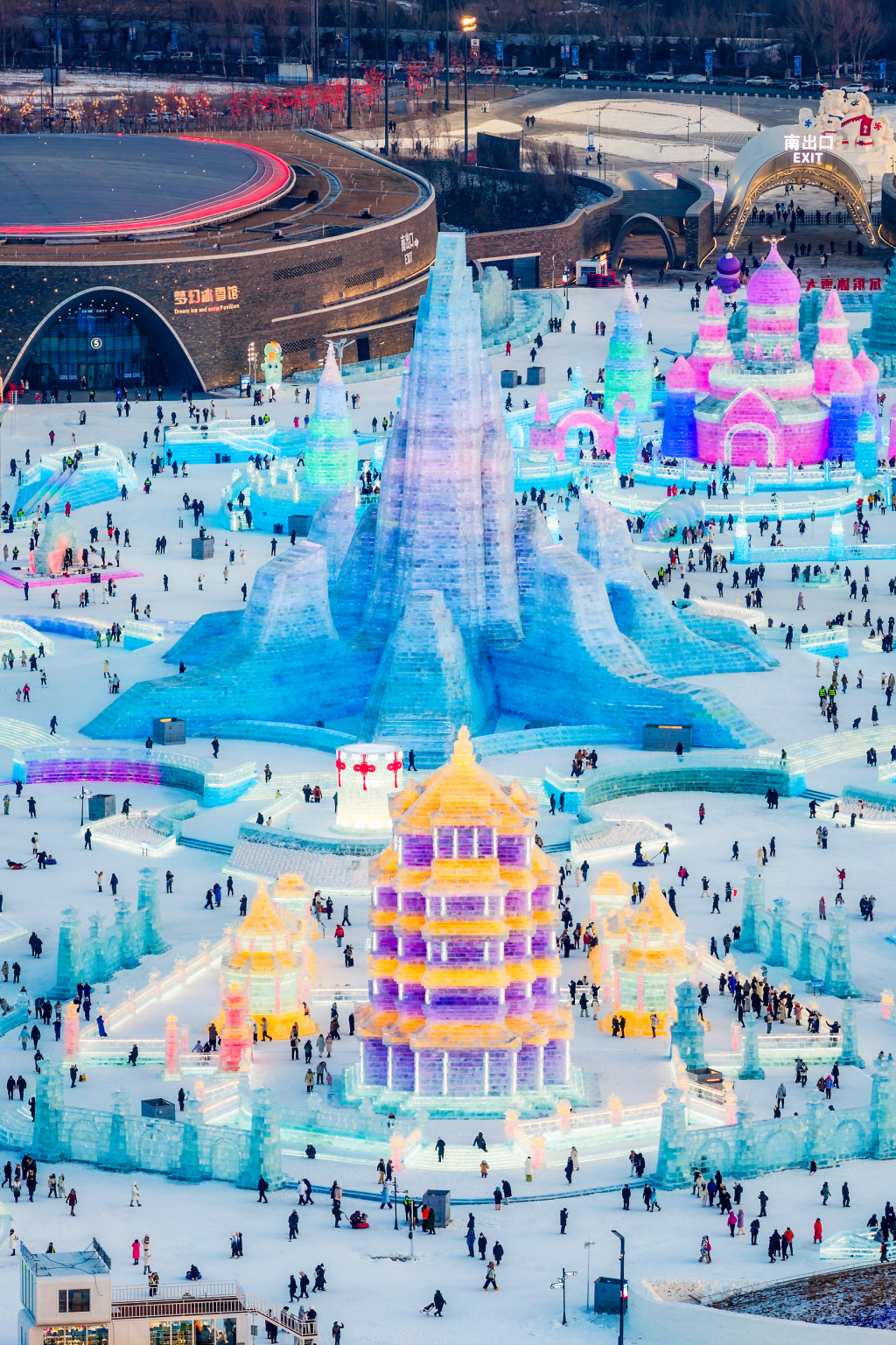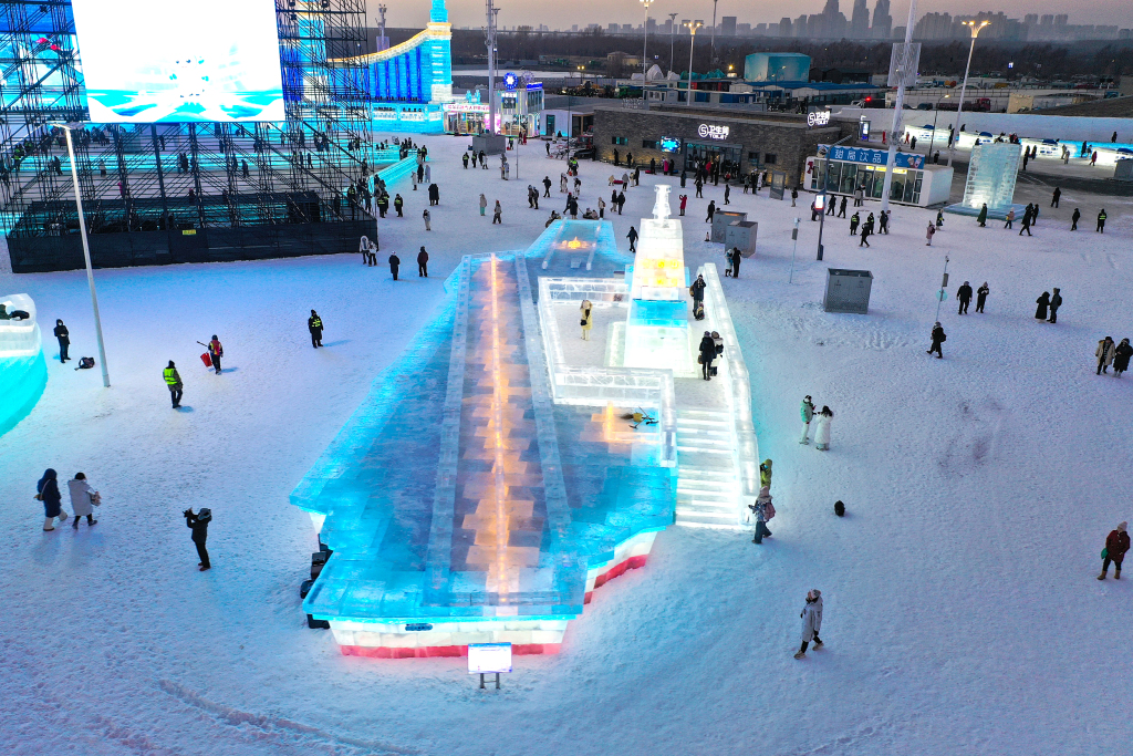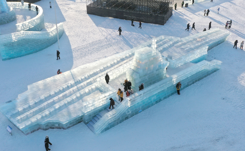 城事|巨型冰雕 “福建舰”亮相!哈尔滨冰雪大世界开园